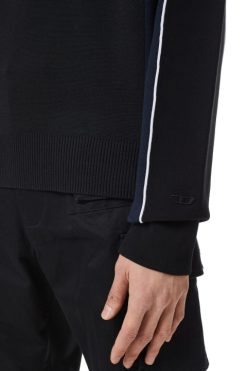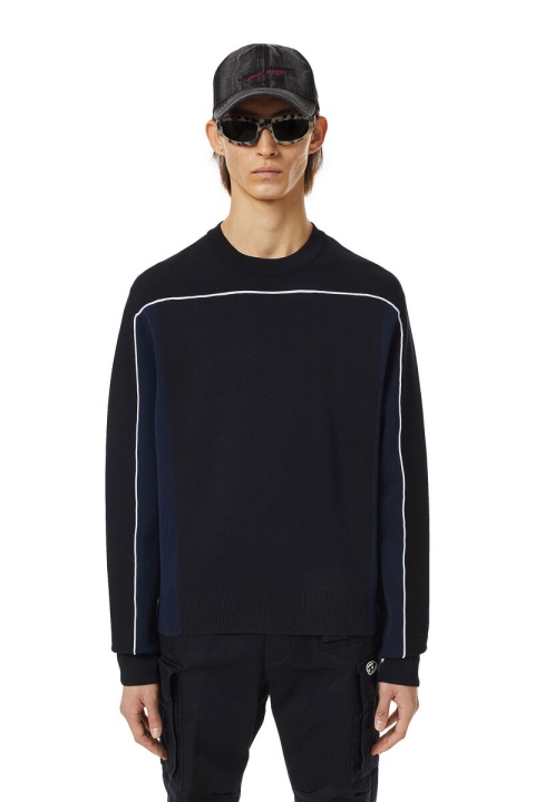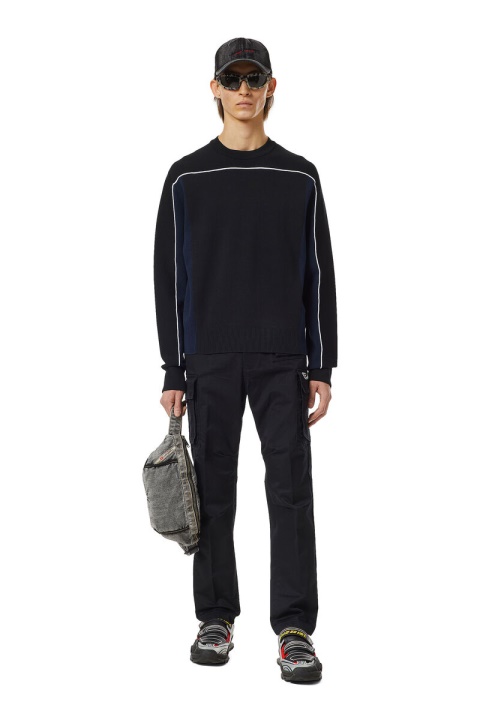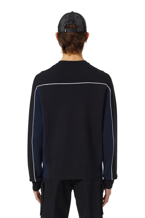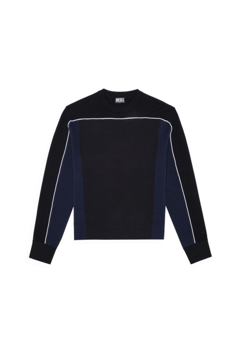 סוודר בלוק צבעוני זה עשוי באמצעות שני חוטים שונים ותפרים סריג. החלק העליון של הגוף והשרוולים סרוגים בחוט טכני, בעוד שהחלק התחתון הקומפקטי של שריגת מילאנו עשוי מכותנה גז. צנרת ניגודיות מדגישה את העיצוב.