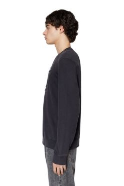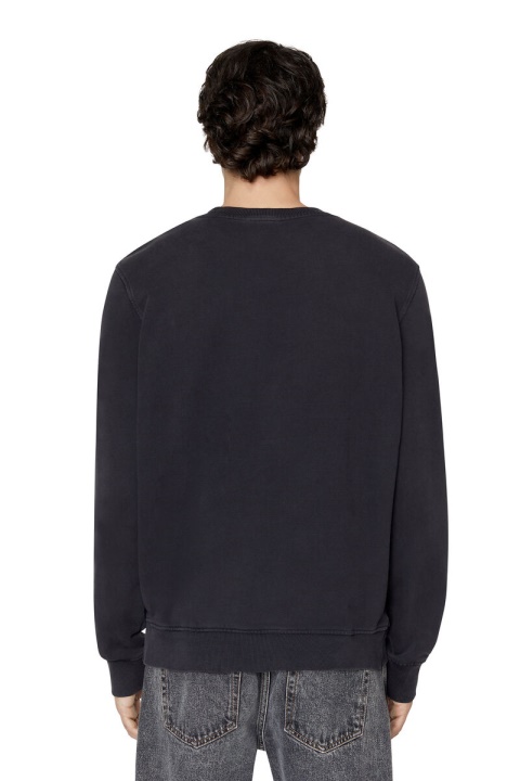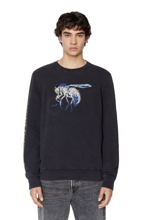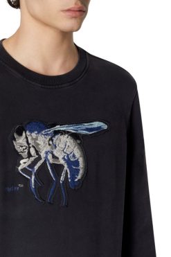 סווטשירט גברים בכושר רגיל עם כתפיים שמוטות, עשוי מג’רסי כותנה עם לולאה. הבגד צבוע בשחור ושטוף קלות בחומצה, לסגנון זה יש תחושת וינטג’ וגרפיקת זבוב נועזת רקומה בחזית.