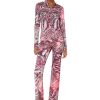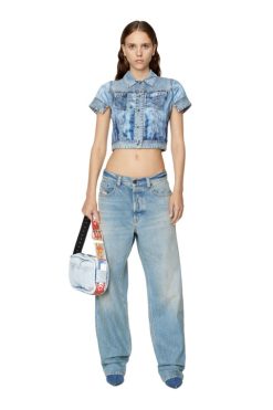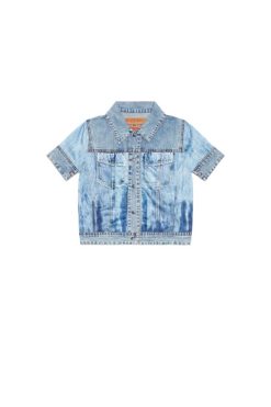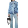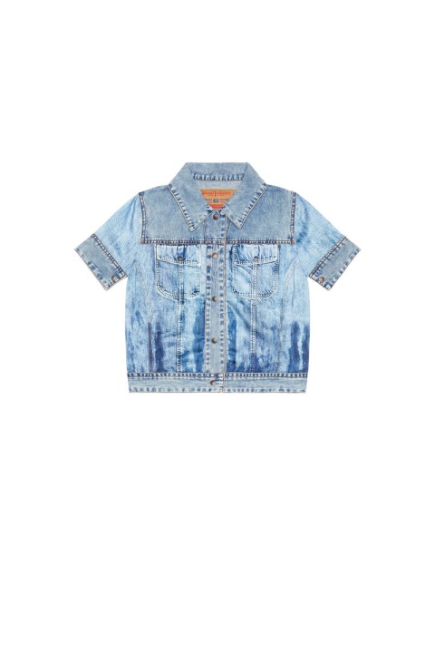 חולצת נשים בסאטן טכני בהיר, עם הדפסה ג’ינס טרמפ ל’איל לוחות ג’ינס אותנטיים שטופי אבן. סגנון שרוול קצר זה נחתך להתאמה רגילה ויש לו אורך קצוץ.