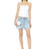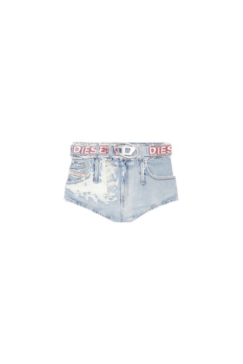 מכנסי ג’ינס קצרים לנשים בנויים עם מראה משוחרר והרוס בשכבות על מכנסי חם בגזרה דקה. סגנון חמשת הכיסים שלם עם חגורה תואמת, רקומה עם הלוגו של דיזל. ביטוי של ה-DNA של דיזל, המראה ההרוס הזה עשוי מג’ינס קבוע עם שטיפה תכלת. האפקטים הקרועים הקיצוניים משולבים עם שכבות עדינות כדי שהבגד יהיה לביש מושלם.