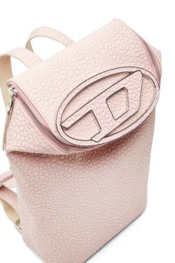 תיק גב לנשים עם כתף אחת זהנוי מעור ורוד, בעל מרקם בועות תלת מימד עם גימור מטש וציפוי עמידה בפני פעולות. טלאי ד אליפסה ממתכת על הדש מצופה באותו עור למראה אחיד.