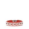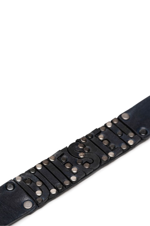 צמיד חפתים לגברים עשוי עור שחור, מתהדר בעיצוב לוגו מקסי משובץ. מפורט עם ניטים על כל הגוף בגווני מתכת מנוגדים, הוא מהדק עם סגירת כפתור מתכווננת.