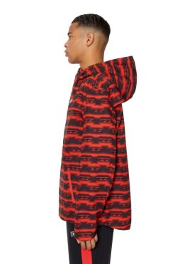 ז’קט קפוצ’ון לגברים של DIESEL SPORT חתוך ממעטפת עמידה במים, בדוגמת מוטיב מונוגרמה ‘D’ חוזר היוצר פסים דו-גווניים מדורגים. הבד, התפרים המלוכדים ורוכסנים חסינים לטפטוף מונעים את הגשם, בעוד שהפתח האחורי מוסת את זרימת האוויר.