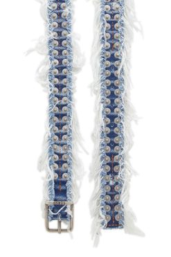 חגורת ג’ינס אינדיגו יוניסקס זו מתעדכנת עם קצוות מרוטים למראה מושחת במיוחד. מפורט עם שתי שורות של מסמרות מתכת לו, מופרדות על ידי תפירת טבק קלאסית.