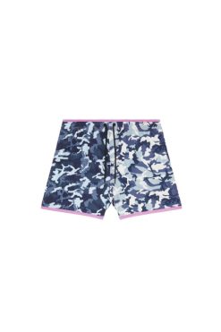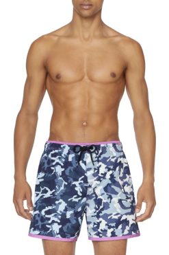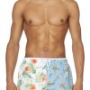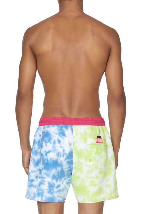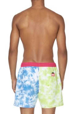 מכנסי ים באורך בינוני לגברים תרופות מבד המתחייב, עם אפקט קשירה בגווני כחול וירוק מנוגדים. חסום בצבע עם רצועת מותן ניאון, שרוך ועיניות, ומודפס עם גרפיקה של אופק בתחתית.