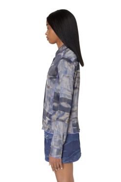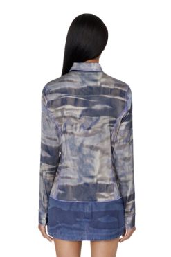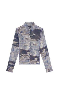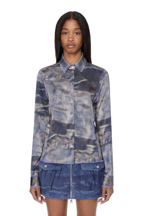 חולצת נשים עם צללית דקה ומחופה, חתוכה מסאטן מתיחה חלק. הבד יוצר באמצעות ויסקוזה עם אישור FSC והדפסה הסודית על כל הפנים, מאוזנת על ידי תפרים צבעוניים. לוח לוגו ד אובלי מדגיש את החזה.