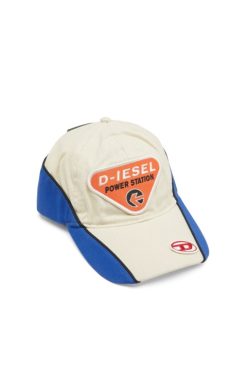 כובע בייסבול לבן, חסום בצבע עם לוחות צד כחולים. בציפוי טלאי לוגו רקומים בחזית, מאחור ובפסגה.