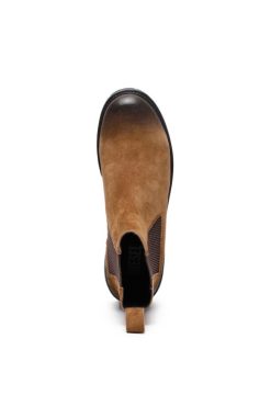 מגפי צ’לסי לגברים מעור נובוק חום, מעודכנים בטיפול מלוכלך בעקב ובבוהן למראה בלו. נעל זוסטית תוספות אלסונית ולשונית אחורית על קלות, ממוקמת על סוליית זיז שמנמנה ומפורטת עם חתך לוגו אחורי.