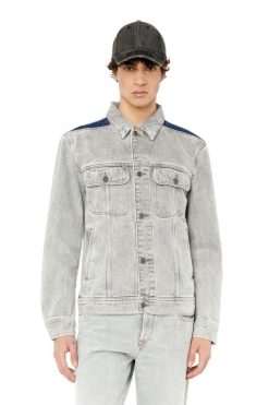 ז’קט ג’ינס לגברים עם צללית בגזרה רגילה. העיצוב המחובר נותן לו מראה דו-גוני. יוצר מכותנה אורגני, כביסה דו-צבעונית זו משלבת טלאי ג’ינס בצבע אפור בהיר וכחול, תפורים ושטופים יחד. תפרים צבעוניים מנוגדים מדגישים את המבנה המיוחד של היצירה.