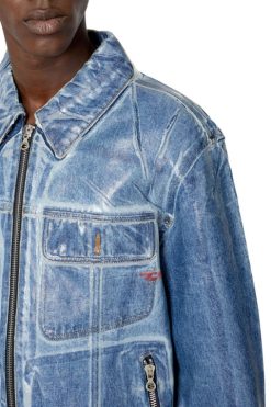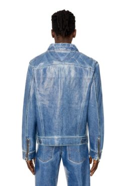FW Runway Show Collection ’22. בצללית משאית מעודכנת, ז’קט מצופה גברים זה התאמה רגילה ונסגר עם רוכסנים בחזית ובחפתים. כביסה כחולה כהה זו, מעוצבת מג’ינס קבועה, כוללת שילוב של טכניקות יצירה מוגברות: טיפולי חום ובביסה מיוחדת אפקט “סרט” מבריק על כל הבגד.
