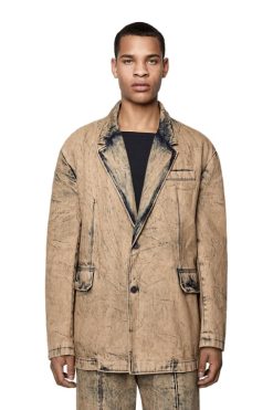 בלייזר ג’ינס צבוע יתר על המידה. מפורט עם רקמת ד על דש הכיס, יש לו צללית קופסת, חד חזה וננעלת עם שני כפתורי שוק. כביסה צבעונית זו עשויה מג’ינס קבוע בתערובת של סיבי כותנה וקנבוס. את בניית הבגד.