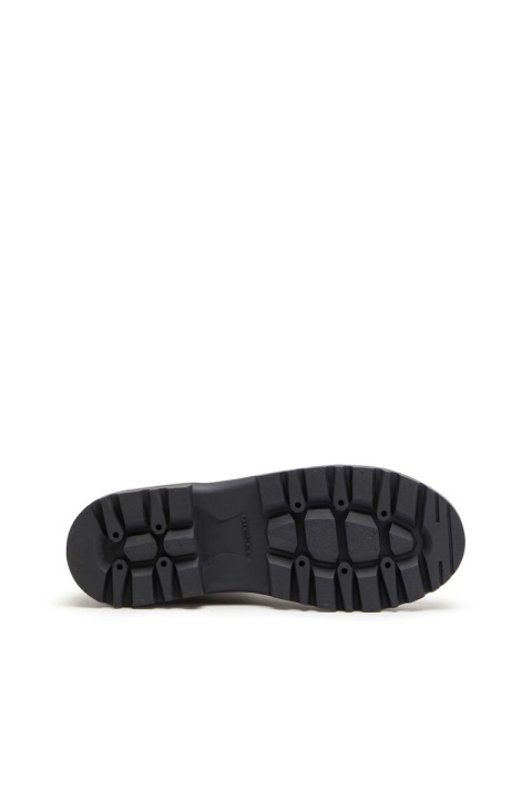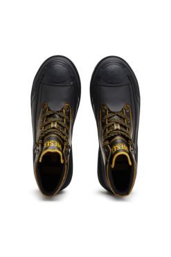 מגף עור עיצוב צבאי זה מחוזק עם שכבות גומי מרובות וסוליית זיז שמנמנה. מודגש עם עיטורי ניגודיות, הוא כולל הדפסה צבאית של תעשיית הדיזל בצד לוגו מוגבה על הלשון.