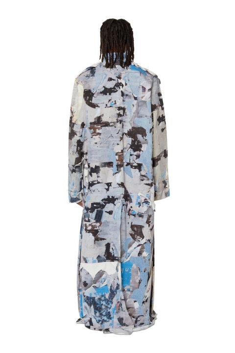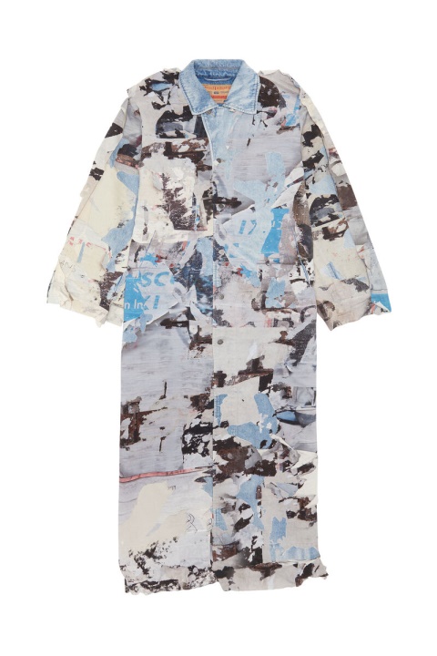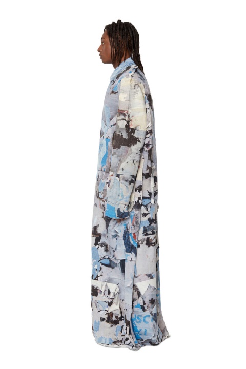 מעיל גברים זה לרעיית הרצפה הוא חלק מקולקציית FW Runway Show ’22. נראה בתערוכת המסלול, הוא כולל אפקט אומנותי דרמטי מעורר כרזות זבובים ישנות שמתקלפות מהקיר. המראה הייחודי כולל 22 שכבות מודפסות חופפות של בד פיקס, עם אפקטי פילינג בלעדיים החוקרים את הרעיון של כרזות וינטג’ של “מניפסט”.