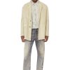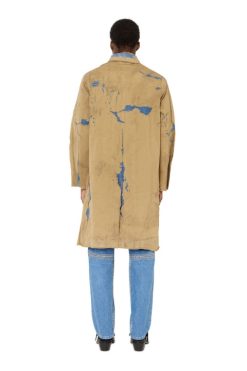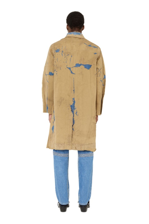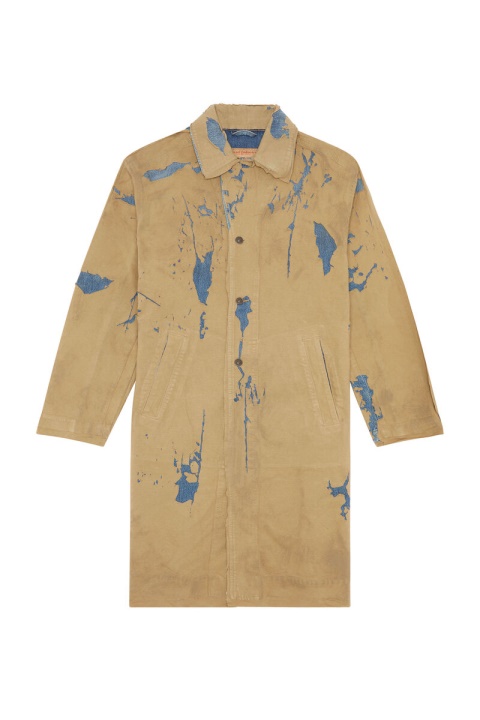 מעיל רכב לגברים באורך הברך המותאם להתאמה רגילה. ג’ינס מתקן זה מציג אפקט פילינג לא שגרתי. הוא עשוי מג’ינס תקן בגוון בינוני, שטוף אבן לרכות ומכוסה בשכבה לא אחידה של ג’רסי צבוע יתר על המידה. התוצאה מועשרת בשפשופים ובכביסה נוספת לקבלת המראה והעיצוב הייחודיים.