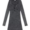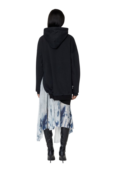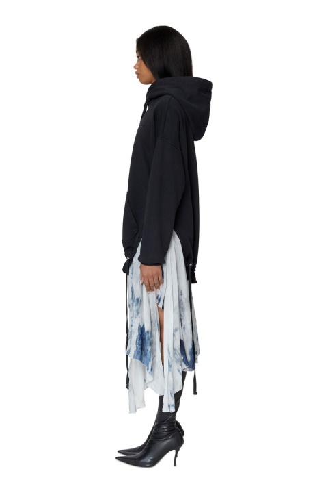 שמלת קפוצ’ון ג’רזי מכותנה עם לולאה, כוללת שולי שרוך מפוצלים עם שיפון אסימטרי עם הדפסה ג’ינס דיגיטלי. הפרופיל הרפוי שלו מוגבה עם כתפיים שמוטו, ממותג עם לוגו ד רקום סגלגל.