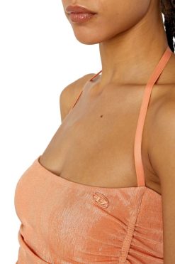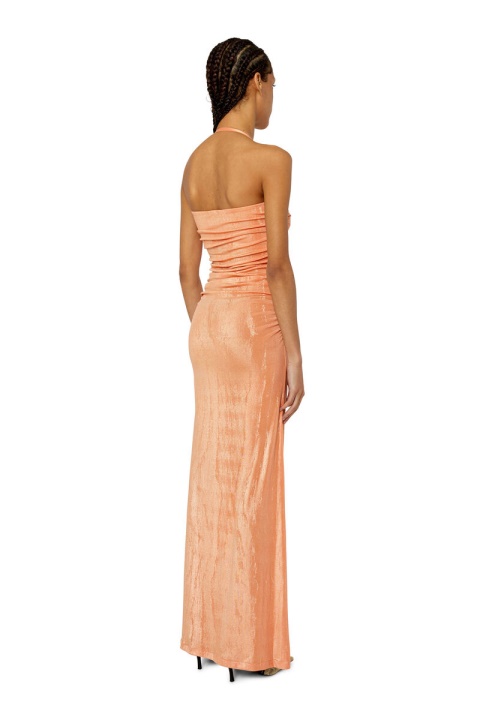 שמלת הלטרנס גזורה מג’רסי מתיחה המצופה בגימור מתכתי באפקט וינטג’. נופל לאורך מקסי, יש לו מחוך מחוך דק מפורט עם לוח לוגו. הגומייה הפנימית שומרת על החלק העליון במקומו.