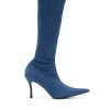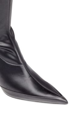 מג ברך שחורים לנשים מעורבים מסאטן מתיחה מבריק, מרכיבים אצבעות מחודדות מגורדות בעור ועקבי הטו. הפיר הגמיש חובק את השוק, מציג כיסים תועלתניים עם רוכסן.