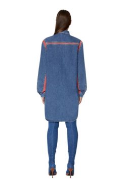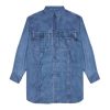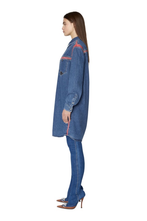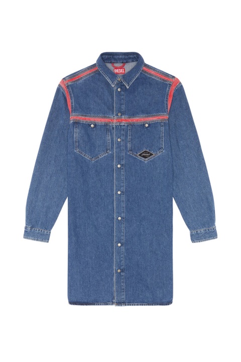 החולצה הארוכה הזו היא בהשראת עיצובים ארכיונים. כולל תוספת לוגו וינטג’ וצמדני מתכת, הוא עשוי מלוחות של ג’ינס בצבע כחול בינוני, מקושרים יחד עם בד אדום מנוגד. הכביסה הסופית מעניקה מראה טבעי לחיות.