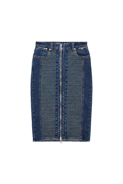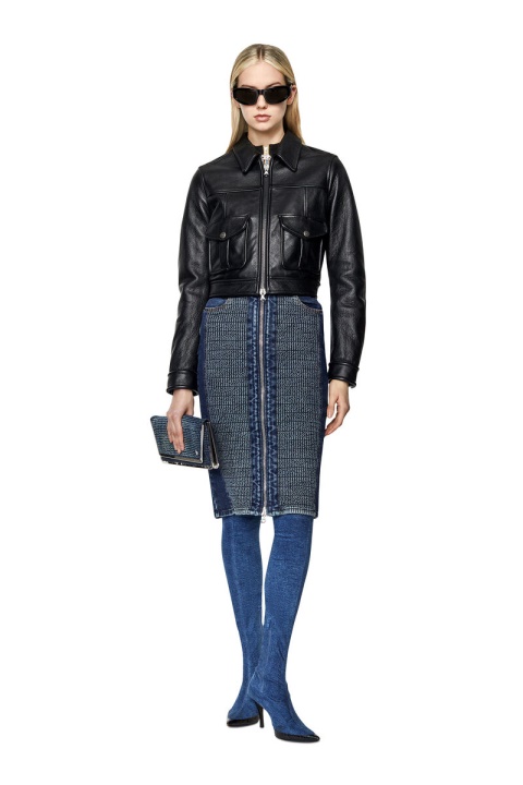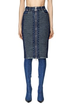 חצאית עיפרון מועשרת ברוכסנים גלויים ומשיכות לוגו ד מעוצב מג’ינס נמתח, כביסה כחולה כהה זו מציגה את אומנות הג’ינס של דיזל. לוחות תפר חלוקה הגווני נתפרים ביד ומרופדים קלות כדי ליצור את האפקט האסוף האופייני.