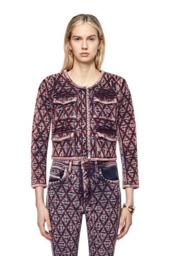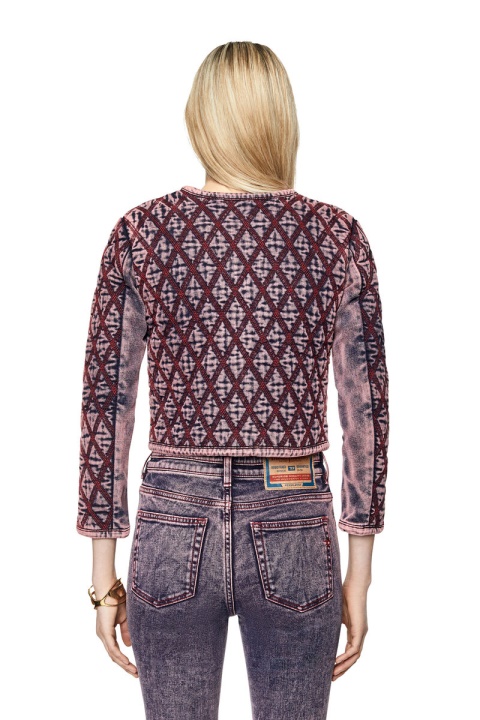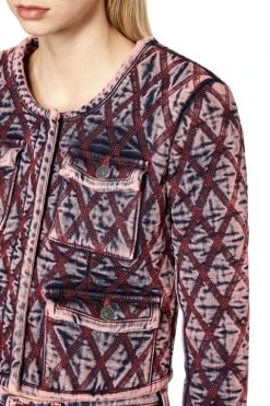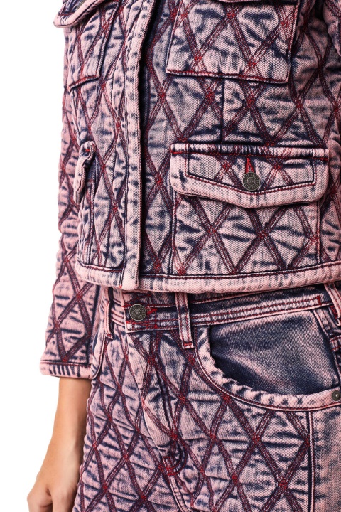 קולקציית תצוגות אופנה SS22. ז’קט Slim Fit מעוצב עם צווארון ללא צווארון וכיסי דש. כביסה ייחודית זו עשויה מג’ינס מרופד קל משקל טיפול בגוונים בהירים וכהים. הוא מועשר בתפרים משולשים שמהנהנים לדפוסי ארגייל וצבוע יתר על המידה עבור מגע של ניגודיות.