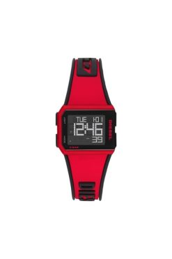 אחריות השעון הקצוץ הזה בגודל 38×33 מ”מ כולל מסך תצוגה שלילי, נרתיק ניילון ורצועת סיליקון אדומה לחוץ לוגו.
