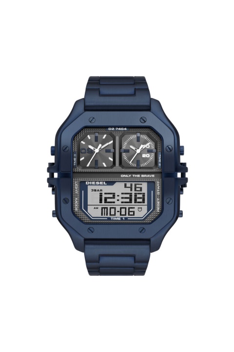 אחריות שעון Clasher בגודל 58 מ”מ של דיזל כולל חוגה ממתכת שמש, תנועה דיגיטלית וצמיד נירוסטה בגוון כחול.