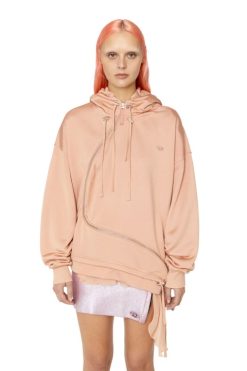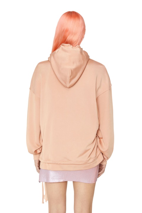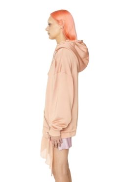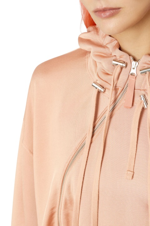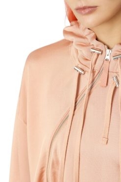 מעיל סוודר עם קפוצ’ון רגוע זה כולל צללית נוזלית, משופרת על ידי סגירת רוכסן א-סימטרית. הוא עשוי מגיזת כותנה צבועה בפיגמנט עם תוספת שיפון ויסקוזה נוזלית בשוליים, ומפורטת עם רקמת D אליפסה על החזה.