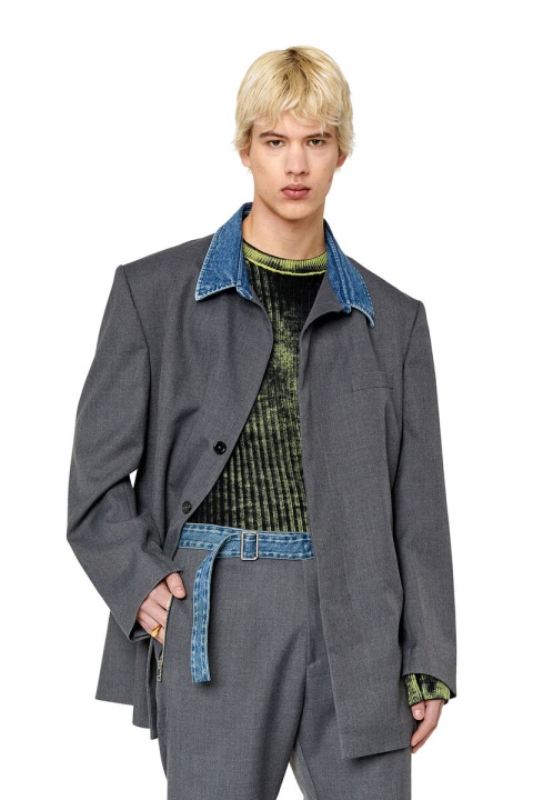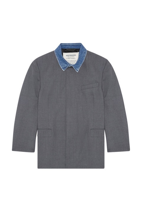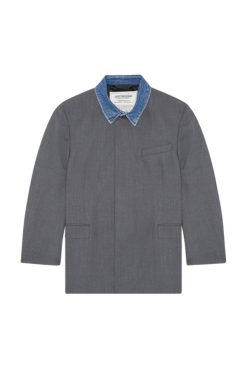 בהשראת סגנונות מחויטים, ז’קט גברים זה מתהדר בצללית רשמית מפורקת. גזרה בגזרה רופפת מתערובת צמר איטלקית, היא מעודכנת עם צווארון ג’ינס ניגודי.