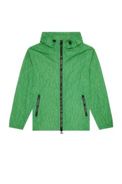 עם קפוצ’ון מגן, ז’קט קפוצ’ון זה חתוך לצללית רפויה עם חפתים מתיחה ושולי שרוך כדי להתאים את ההתאמה. בד הניילון הממוחזר מודפס בטכניקה מיוחדת היוצרת מראה מוגבה מישוש על אותיות הלוגו של דיזל.