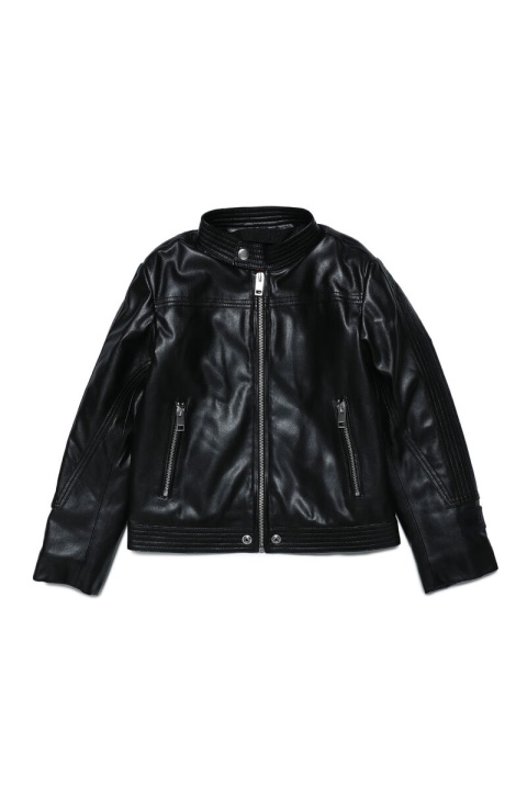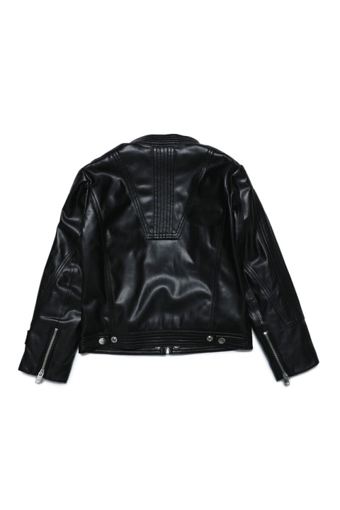מעוצב מבד מצופה שחור, מעיל האופנוענים לבנים זה בעל צללית רייסר מינימלית אורפוד לחום.