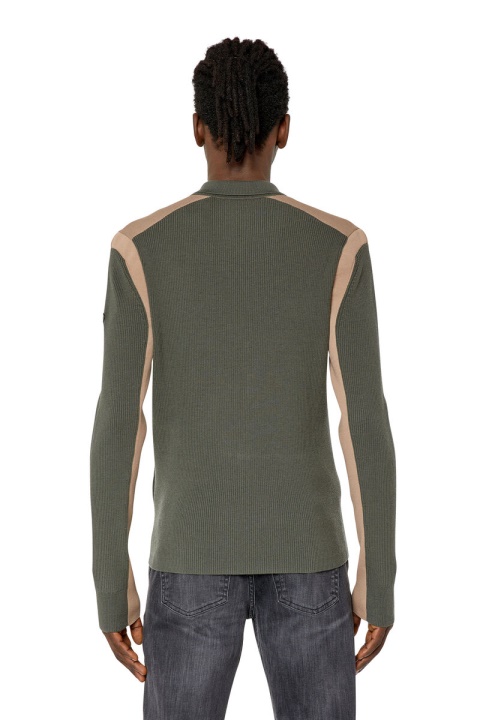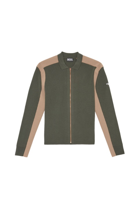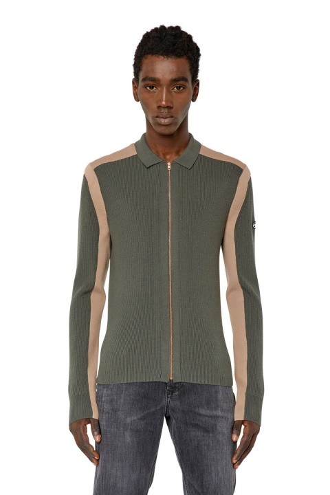 קרדיגן מצולע לגברים זה, המסתובב מצמר אפור, בעל צווארון פולו ורוכסן קדמי. לוחות הסריג המנוגדים עוקבים אחר התפרים, משפרים את ההתאמה היעיל.