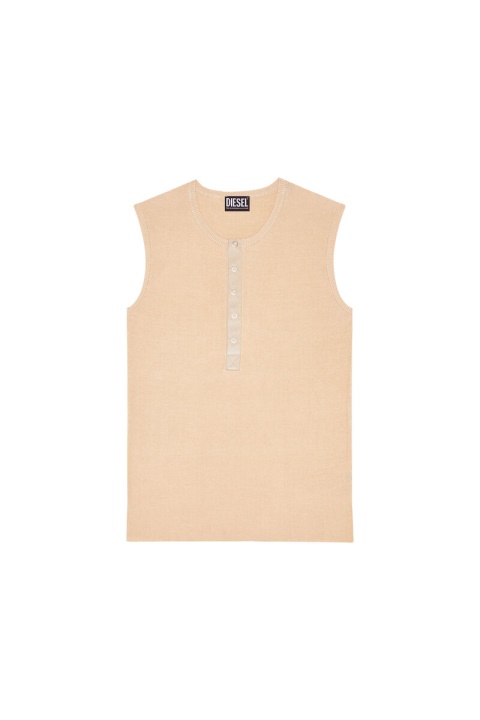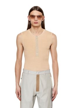 גופיית הנלי זו היא נוסח צמוד, סרוגה בצלעות בטכניקת ציפוי לאפקט עדין בשני גוונים. חלק מקולקציית המסלולים של דיזל SS22, הוא עשוי מכותנה עדינה וארוכה במיוחד ויש לו כיסום מגע זמש מהודק עם כפתורי הצמד.