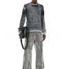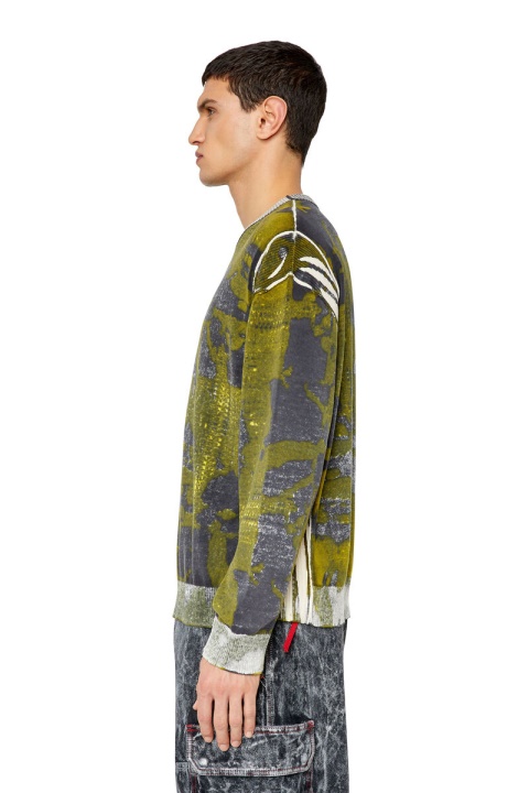 סוודר לגברים מכותנה חלקה עם גז. כולל תוספות צלעות לניגודיות מרקם, סגנון זה מודפס עם דוגמת הסוואה ירוקה-אפורה מבפנים כדי ליצור מראה ייחודי ולא סדיר מבחוץ.