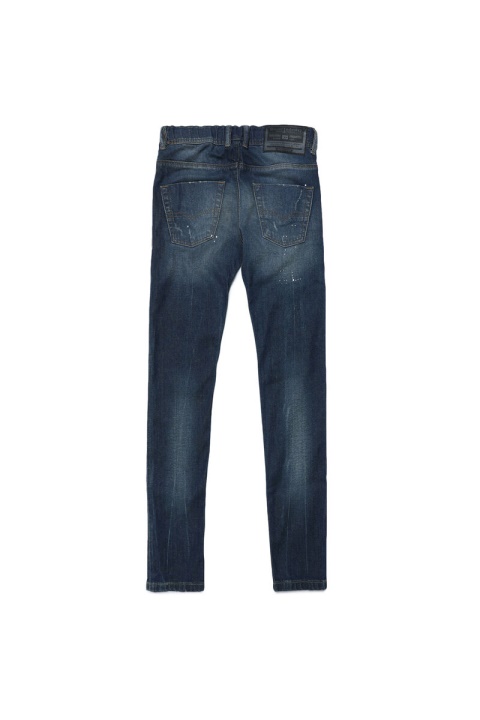 סגנון מחודד עם שרוך מוטן ורגל מרווחת שמצטמצמת לכיוון הקרסול. ג’ינס מתיחה זה מציג כביסה כחולה כהה עם מראה משומש אותנטי המועשר באפקטים של לכלוך, שפם תלת מימד, פעולות וכתמים לבנים.