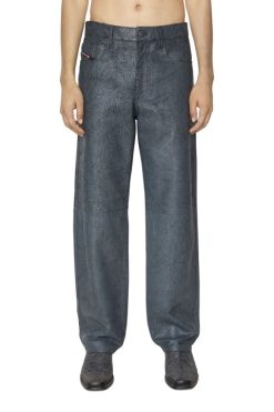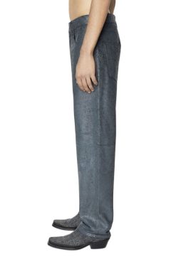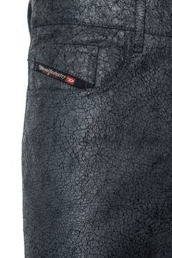 מכנסי גברים אלה מעורער טלה מצופה שסיים עם טיפול סדוק כדי לחשוף את הצבע הכהה יותר מתחת. יש להם צללית בהשראת ג’ינס והתאמה רגילה.
