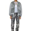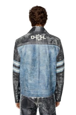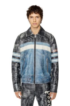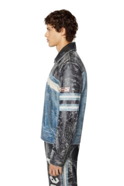 מעיל קואצ’ר קולקציית FW22 לגברים מעור סדוק גמיש, מטופל למראה וינטג’. הדפס Trompe L’oeil יוצר אשליה של סגנון אופנוענים בגווני שחור, כחול ולבן.
