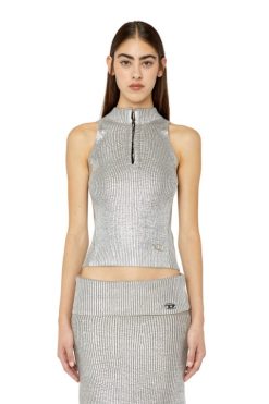 לטנק לנשים זה, עם צוואר מדמה מהידוק קרס, יש צללית דקה ורוכבת סרוגה מצמר. הציפוי המתכתי המבריק גורם למרקם המצולע לפוצץ.