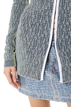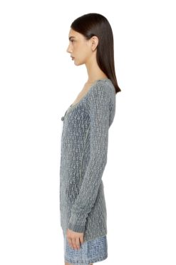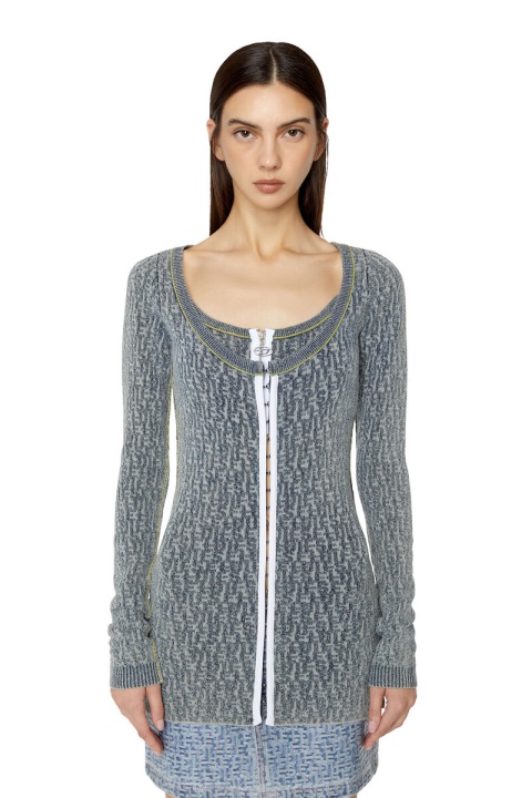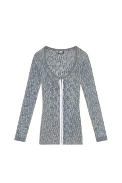 קרדיגן עם צווארון סקופ לנשים עם גזרה דקיקה וארוכה וחיבורי קרס. נראה בתערוכת המסלול של סתיו 22′, הוא עשוי מסריגת לוגו-אקארד בתערובת של צמר מסורק חלק וחוטי בוקל אינדי-כחול למישוש. הפעלה באינדיגו בשילוב עם שטיפת אבן מעניק לבגד זה תחושת גינס.