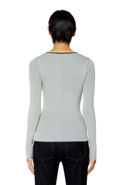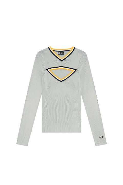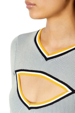 סריג צמוד, חולצת נשים זו בעלת צווארון V וחיתוך חזה משולש, שניים מעוטרים בפסים ספורטיביים. הוא נסרג בצלעות בטכניקת ציפוי כדי להשיג את האפקט הדו-גוני המדיים ומסתיים עם תיקון ה-‘D אליפסה’ על השרוול.