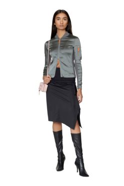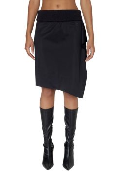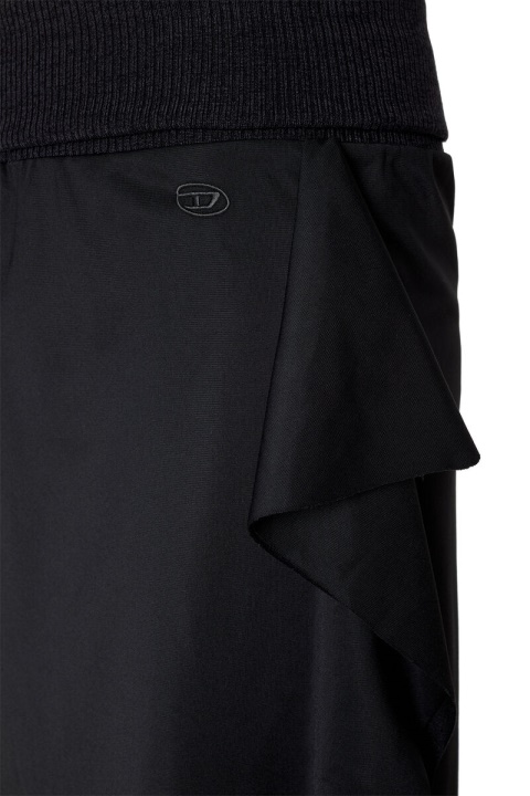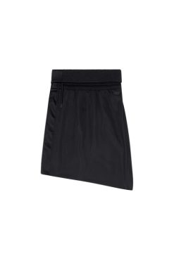 חצאית שחורה זו מעוצבת עם שרוך סרוג בצלעות, עשויה מבד מבריק ויש לה צללית א-סימטרית מרופדת עם שולי חיתוך גולמי. החלק הקדמי רקום עם סמל ‘D Oval’.