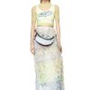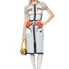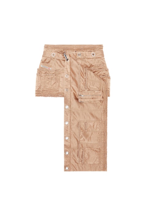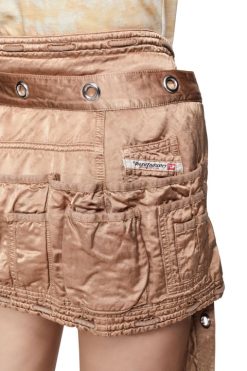 חצאית המיני הזו מתצוגת אביב 22′ חתוכה מסאטן משיי עם בטנה מרופדת. מתוך בגדי עבודה ארכיוניים, יש לו פאנל עם כיס ארוך שנפתח לצללית אסימטרית וגימור דהוי וצבוע בבגד. עיניות המתכת השמנמנות וסגירת הוו מחזקים את המבנה התועלתנית.