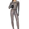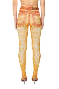 מכנסי סתיו/חורף 2022 Runway Show לנשים מעוצבים בהתאמה לעור שני. המכנסיים מעוצבים מתחרה איטלקית עם הדפס טרמפ ל’איל של ג’ינס וינטג’, עם צללית מותן גבוהה וגרב.