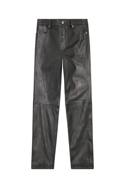 מיזוג של סגנונות אופנוענים וג’ינס, מכנסיים לגברים אלה חתוכים להתאמה רגילה מעור שחור גמיש בצללית עם חמישה כיסים. לוגו המעוצב, בעל אפקט מובלט, נוצר עם לוח מתכת שנכנס מתחת לעור.