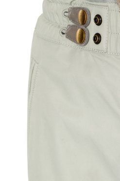 מכנסיים רפויים לנשים אלה חתוכים מטוויל כותנה-ניילון מט, מהודקים עם רוכסן גלוי. ניתן לוסטית את המותניים האלות באמצעות שני שרוכים עם כפתור הצמד. סיים עם תיקון דיזל אחורי.