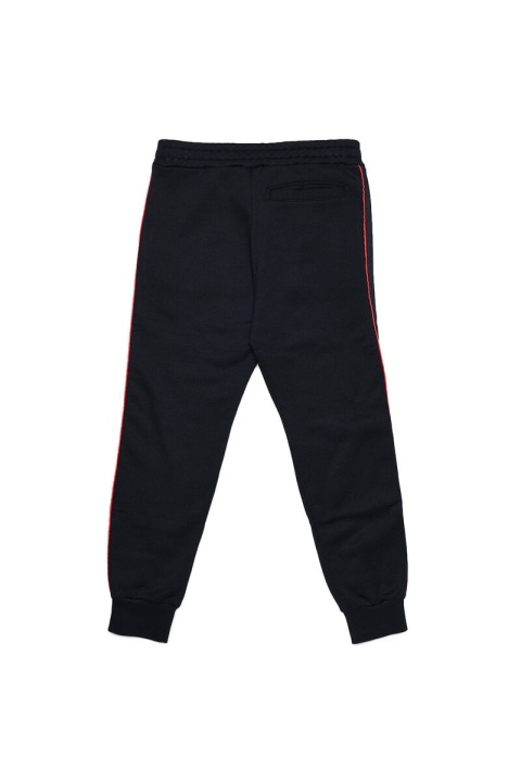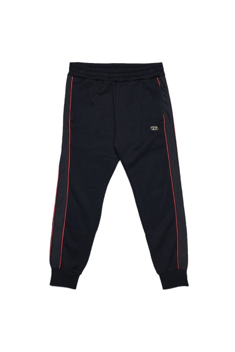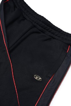 מכנסי הטרנינג לבנים אלה מבד שחור דמוי טכני, עם רצועות צד גוניות חלקות וצנרת אדומה מנוגדת. החלק הקדמי מסומן עם לוח מתכת ‘סגלגל D’.