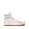 נעלי סניקרס גבוהות לגברים עם סוליה מלוכלכת במצוקה. החלק העליון של השרוכים עשוי מג’ינס כחול, משובץ בלייזר עם דוגמת מונוגרמה.