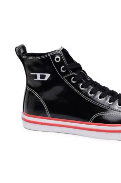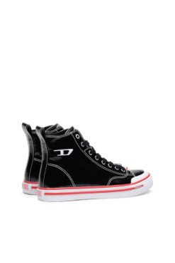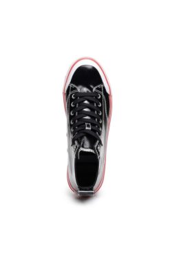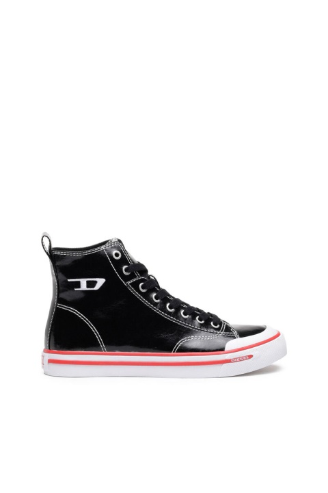 גופיות גבוהות לגברים עשויות ויניל מבריק. מתאמנים אלה כוללים לוגו D רקום בצד, גימוריהם עם תפרים ניגודיים ומוצבים על סוליות גומי מגופרות.