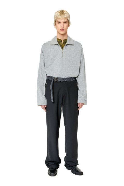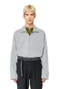 חלק עליון גברים עם צללית היברידית. לחזית הג’רזי האפור יש צווארון רוכסן המהנה לסגנונות פולו, בעוד שגב הפופלין נראה כמו חולצת פסים קלאסית. לוגו ‘אובלי ד’ רקום מעט את החפת השמאלי.