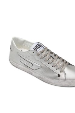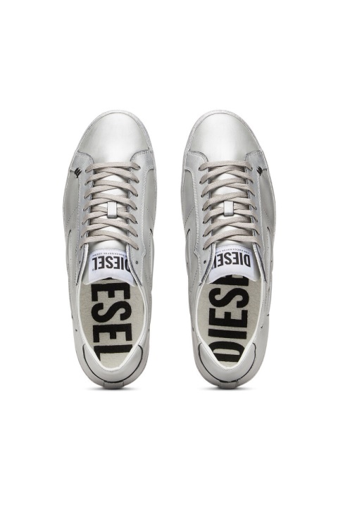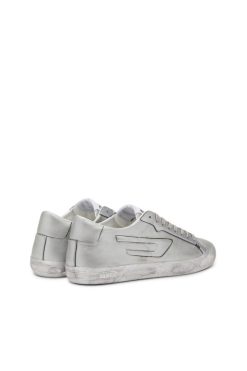 סניקרס לגברים מעור מטאלי רך. לנעליים הנמוכות הללו, שהן מועקות מראש לאפקט משומש, יש מראה כסוף שכולו מקוזז על ידי הסוליה האדומה. החלק העליון מסומן עם מיתוג D מרופד ושלושה תפרים ייחודיים.
