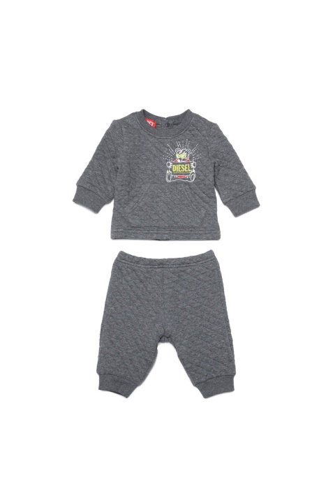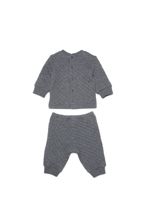 סט שני חלקים זה עשוי מג’רזי כותנה אפורה עם תפירת מעוינים מרופדת. כולל כיס נרתיק קדמי וסגירת כפתור אחורי, החלק העליון כולל הדפסה לוגו דוב על החזה.